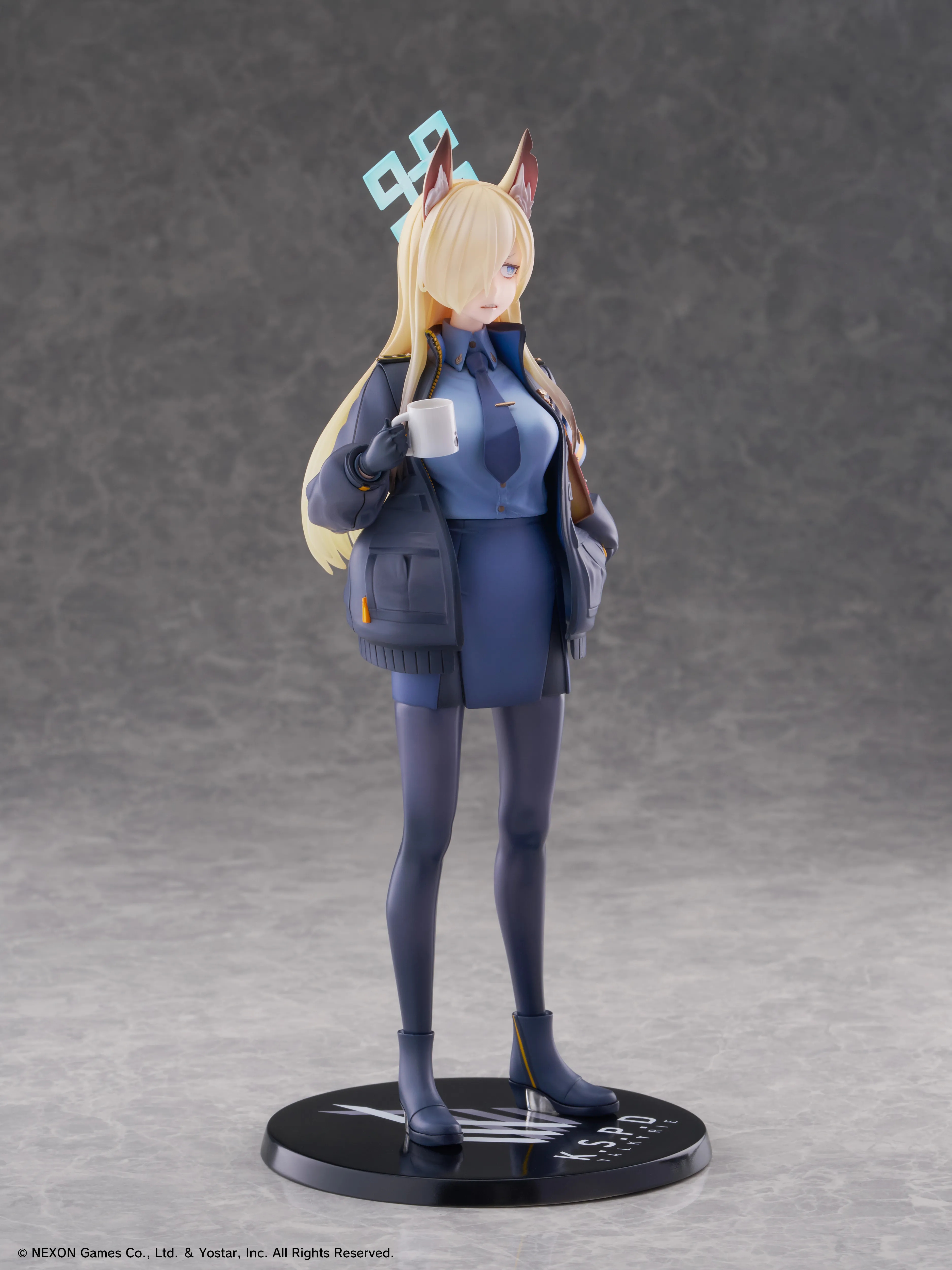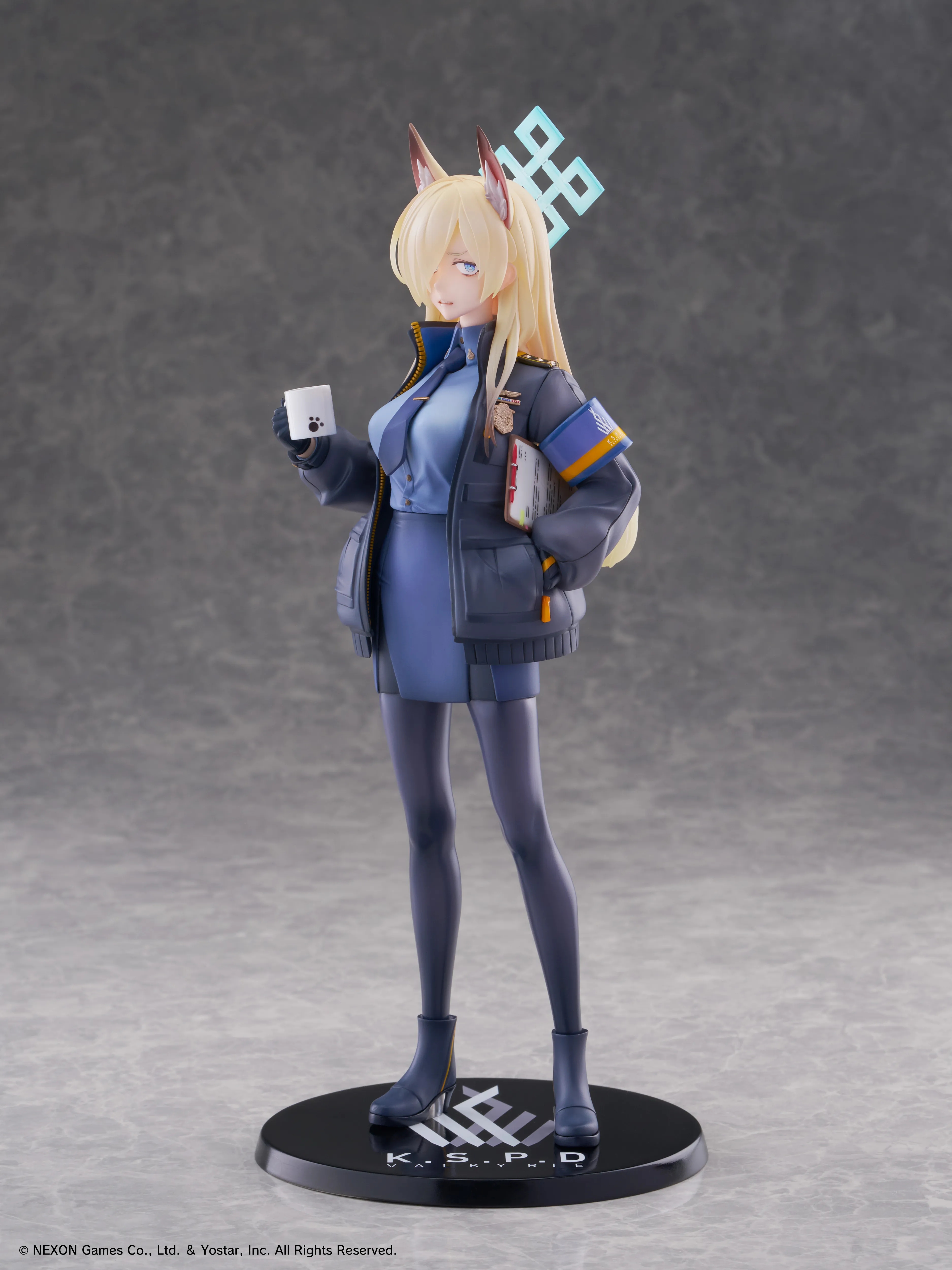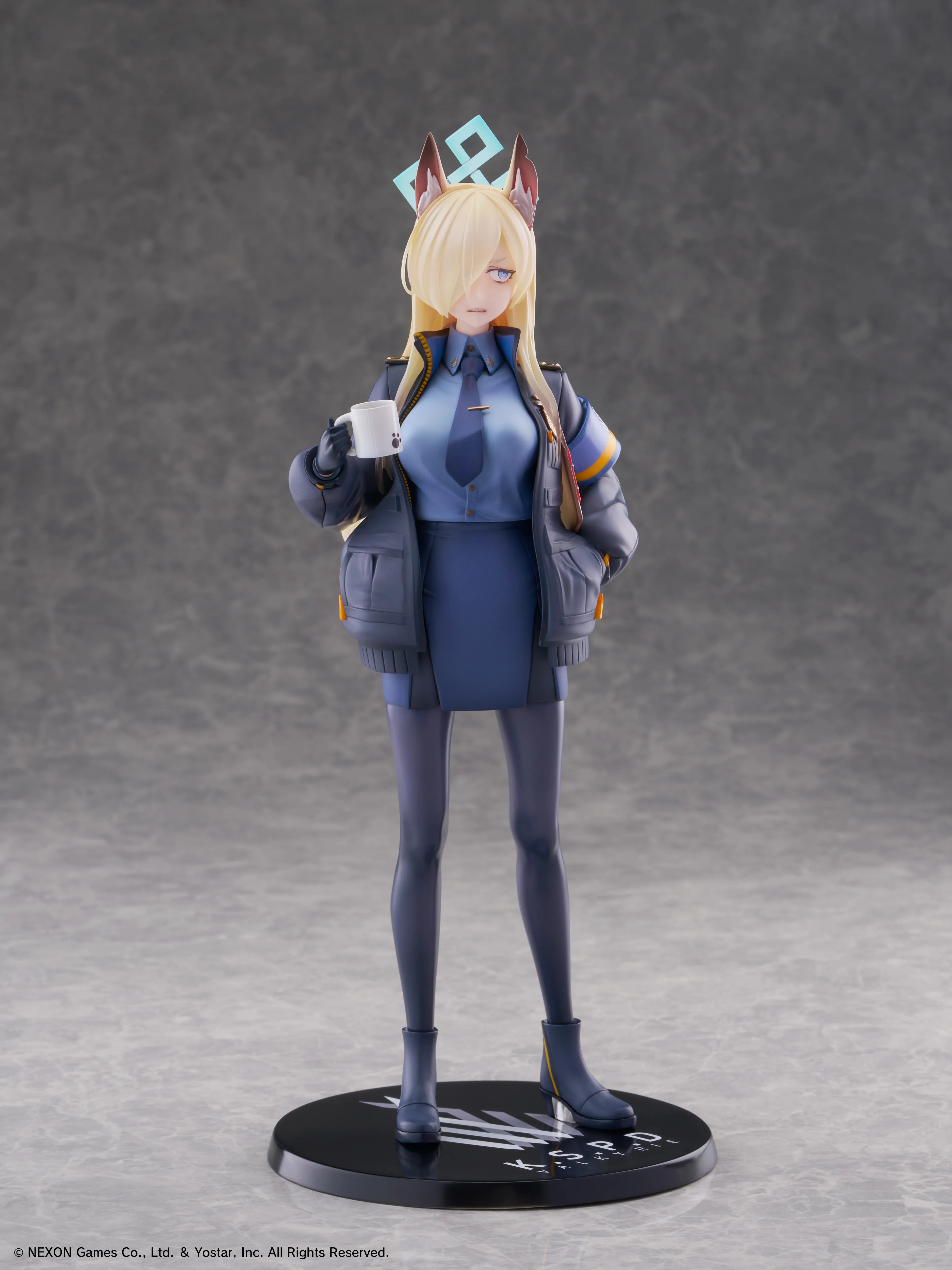 Kanna in her uniform with coffee mug, ready for work!